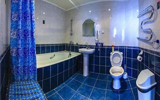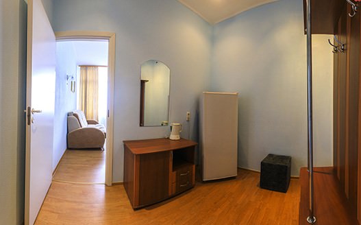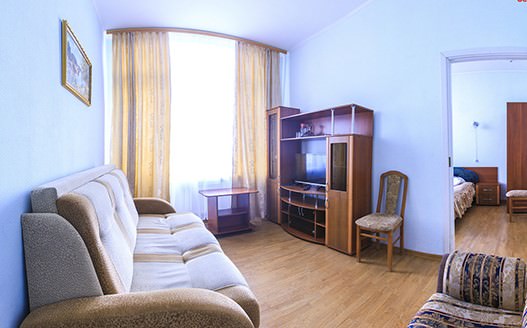 Площадь номера - 35 кв.м. 2 осн. места. 1 доп. место. Мебель: зеркало, кровать двуспальная, прикроватные тумбочки, стол, стулья, шкаф. Оборудование: мини-холодильник, телевизор. Санузел: с ванной/душем, фен. Сервис: Wi-Fi бесплатно, смена полотенец, смена постельного белья, уборка номера.